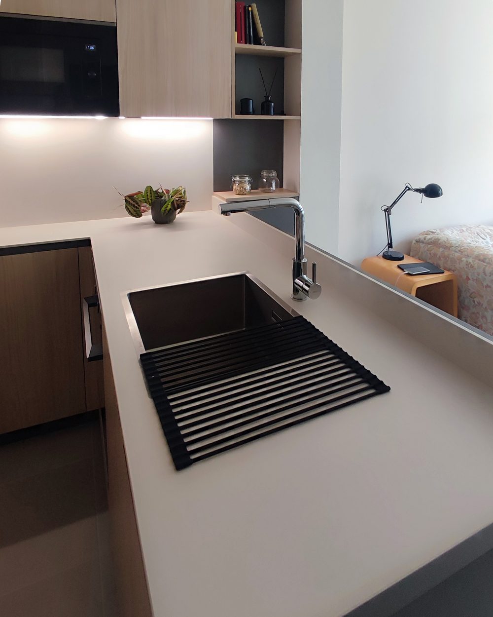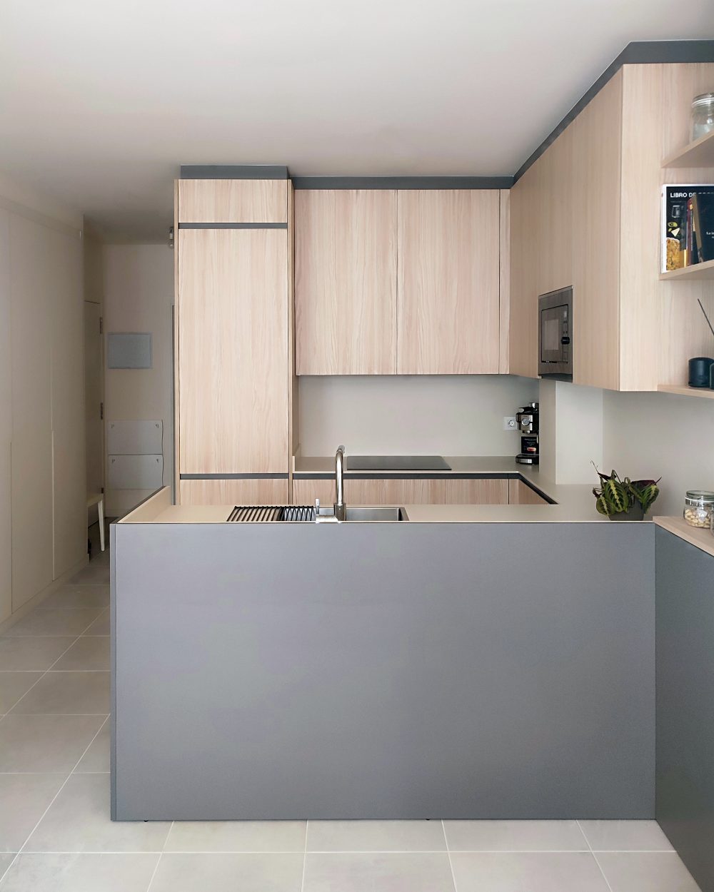 A solução foi mudar tudo. Pensar de forma diferente. Ao imaginar uma península que não só ampliasse o espaço, mas também o enchesse de significado. Ao incorporá-la, a cozinha deixou de ser uma linha perdida na parede e passou a ser uma unidade em forma de U aberta, acolhedora e eficiente.