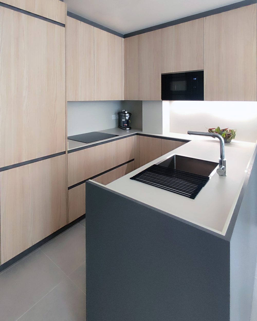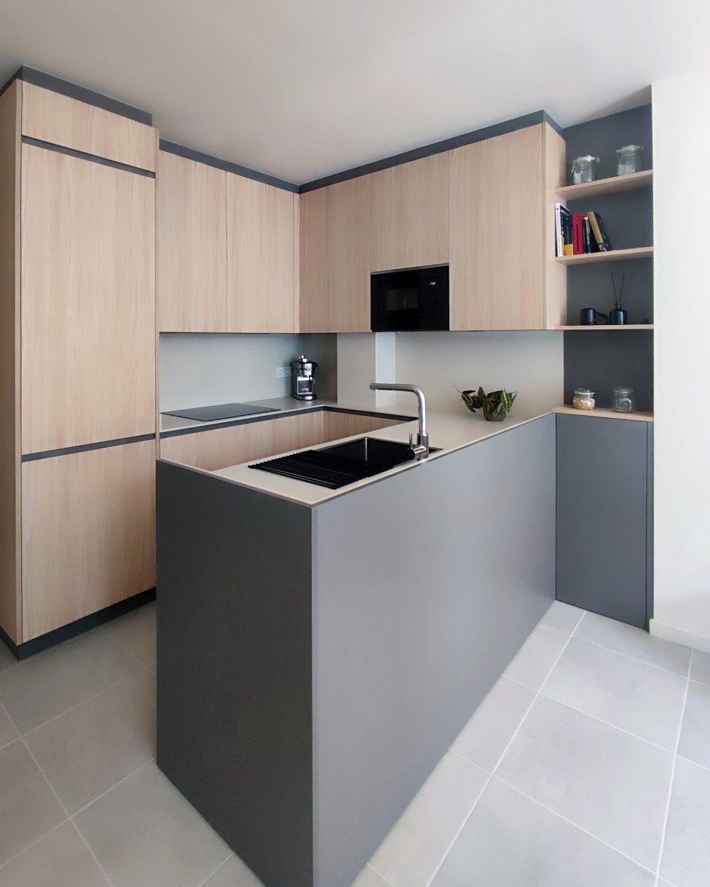Para vestir este novo espaço, escolhemos o modelo Fussion da Senssia, com um delicado equilíbrio entre o natural e o urbano: melamina de abeto natural e cinzento Urban. Uma combinação que transmite calma, estilo e personalidade.
